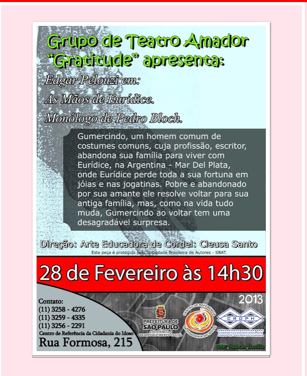 Os alunos da oficina de literatura de cordel do @CRECI (Centro de Referência da Cidadania do Idoso) participarão neste mês de outubro da semana do Idoso. O evento será realizado pelo Fundo Social de Solidariedade (FUSSESP).